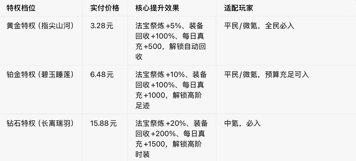分6档特权,均为0.1折解锁永久权益,含海量仙玉、养成材料、专属外观,同时解锁自动回收、法宝祭炼、装备回收收益等核心特权,是所有玩家的长期必入项,按预算拉满对应档位即可。