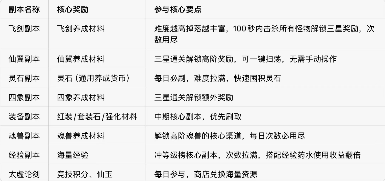 中期战力提升不仅靠付费,日常副本是免费资源的核心来源,覆盖经验、灵石、装备、养成材料等全维度,以下十大副本为每日必参与项,部分可一键扫荡,节省时间,刷取原则为难度拉满、次数用尽,确保资源收益最大化。
