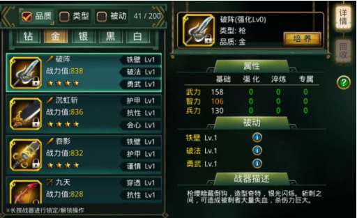 每个武将都有其专属加成的武器,有的武将则有两种专属武器(根据所加被动选择所需要武器)。如图所示,每个武器被动分为两种:小被动和大被动,通常每把武器有2-3条被动,其中最后一条一定为大被动(如图 勇武)其余上面均为小被动(如图 铁壁 破法)。